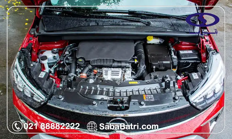 باتری اپل کراس لند در قسمت جلوی خودرو و در محفظه موتور قرار دارد. تصویر بهرو محل قرار گیری باتری اپل کراس لند را نشان میدهد.