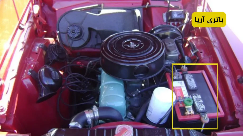 باتری آریا در قسمت پیشرانه موتور قرار دارد. در تصویر زیر میتوانید محل نصب و قرارگیری باتری این خودرو را مشاهده نمایید: